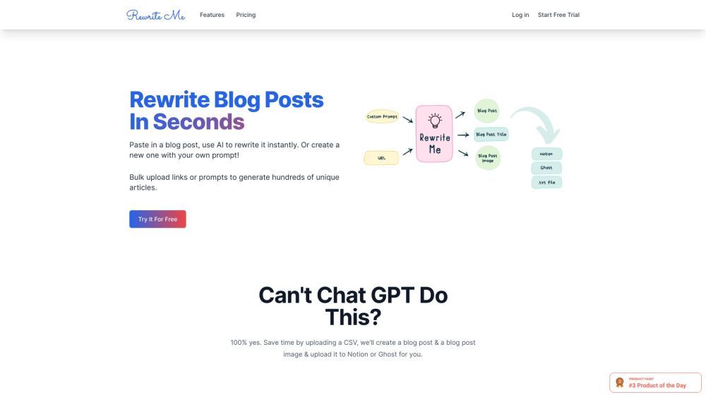 Rewrite Me is an AI-powered tool that allows you to instantly rewrite blog posts. Simply paste in a blog post or create a new one with your own prompt, and the AI will rewrite it for you in seconds. It also offers bulk upload options to generate hundreds of unique articles.
