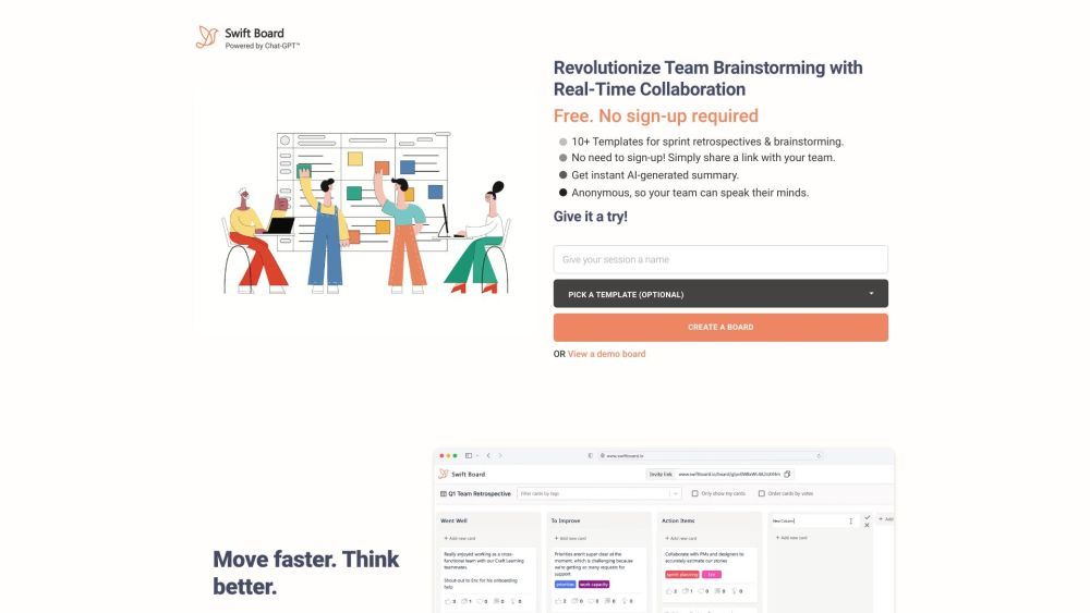 Swift Board is a user-friendly AI-powered tool for real-time brainstorming and sprint retrospectives. It allows you to create and share customizable brainstorming boards without any sign-up or hidden paywalls. Simply click on 'Create A Board' or 'View a demo board' to get started. Collaborate with your team in real-time, prioritize ideas, and filter down to clear action items. Use Chat-GPT to generate a session summary with ease. Swift Board is designed for speed and is completely anonymous, allowing your team to speak their minds.